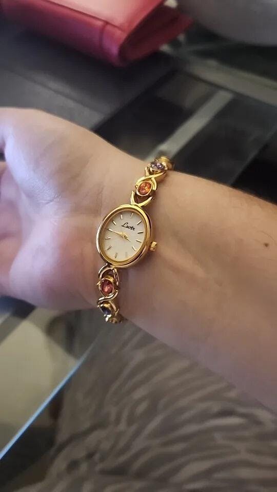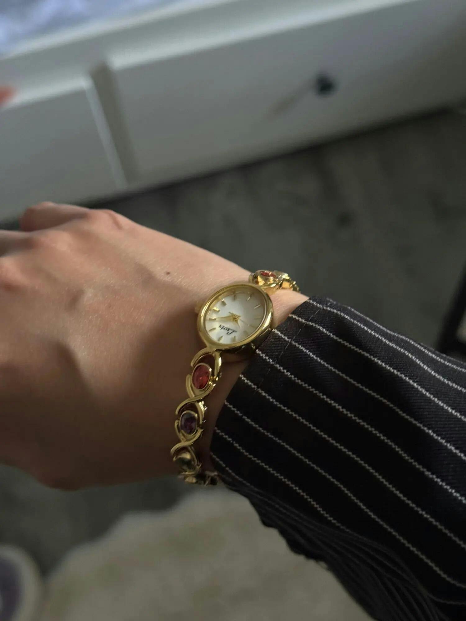 Die Uhr Dorothea ist ein wahres Schmuckstück, das Eleganz und verspielten Charme miteinander verbindet. Das filigrane, goldfarbene Armband ist mit funkelnden, farbigen Schmucksteinen in harmonischen Tönen besetzt und verleiht der Uhr einen luxuriösen und zugleich lebendigen Charakter. Das runde Zifferblatt mit zarter Perlmutt-Optik und schlichten, goldenen Zeigern sorgt für eine zeitlose Eleganz, die perfekt mit dem auffälligen Armband harmoniert. Dorothea ist ideal für besondere Anlässe und für alle, die ein Accessoire suchen, das ebenso edel wie einzigartig ist.